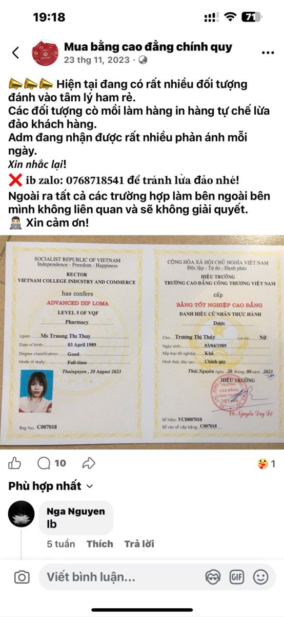 Nhà trường KHÔNG cấp bằng cao đẳng cho người học Trương Thị Thúy, sinh ngày 03/4/1989, học ngành Dược, bằng cấp ngày 20/8/2023, số hiệu bằng VCI0007018, số vào sổ C007018 như trong hình lan truyền.