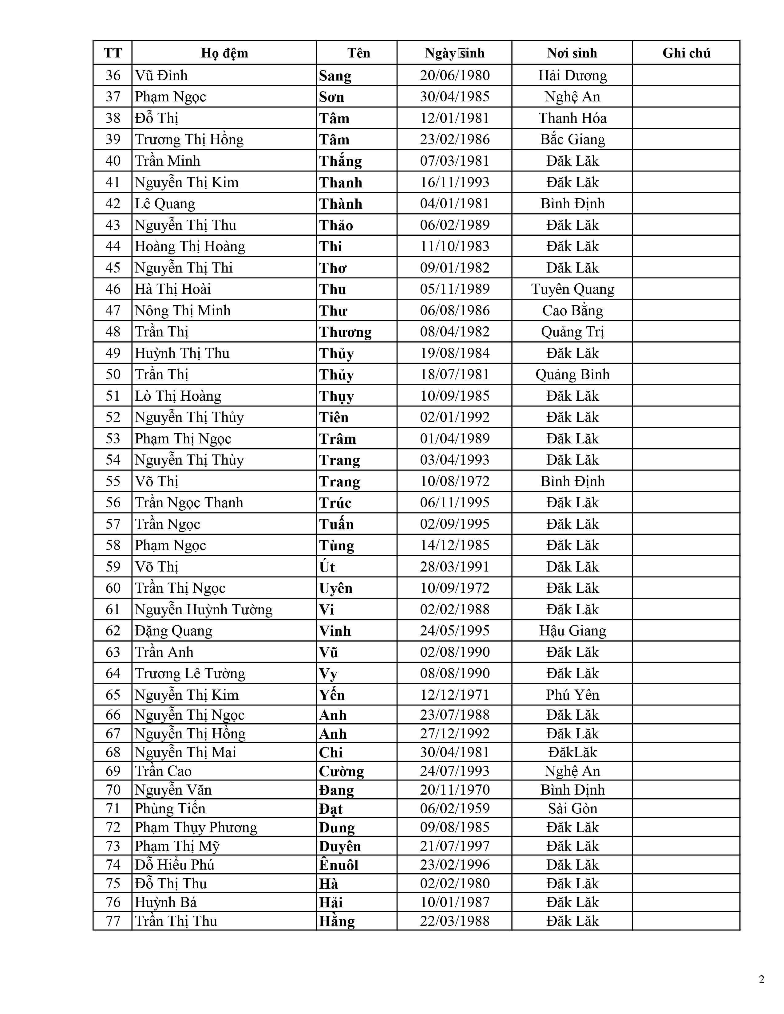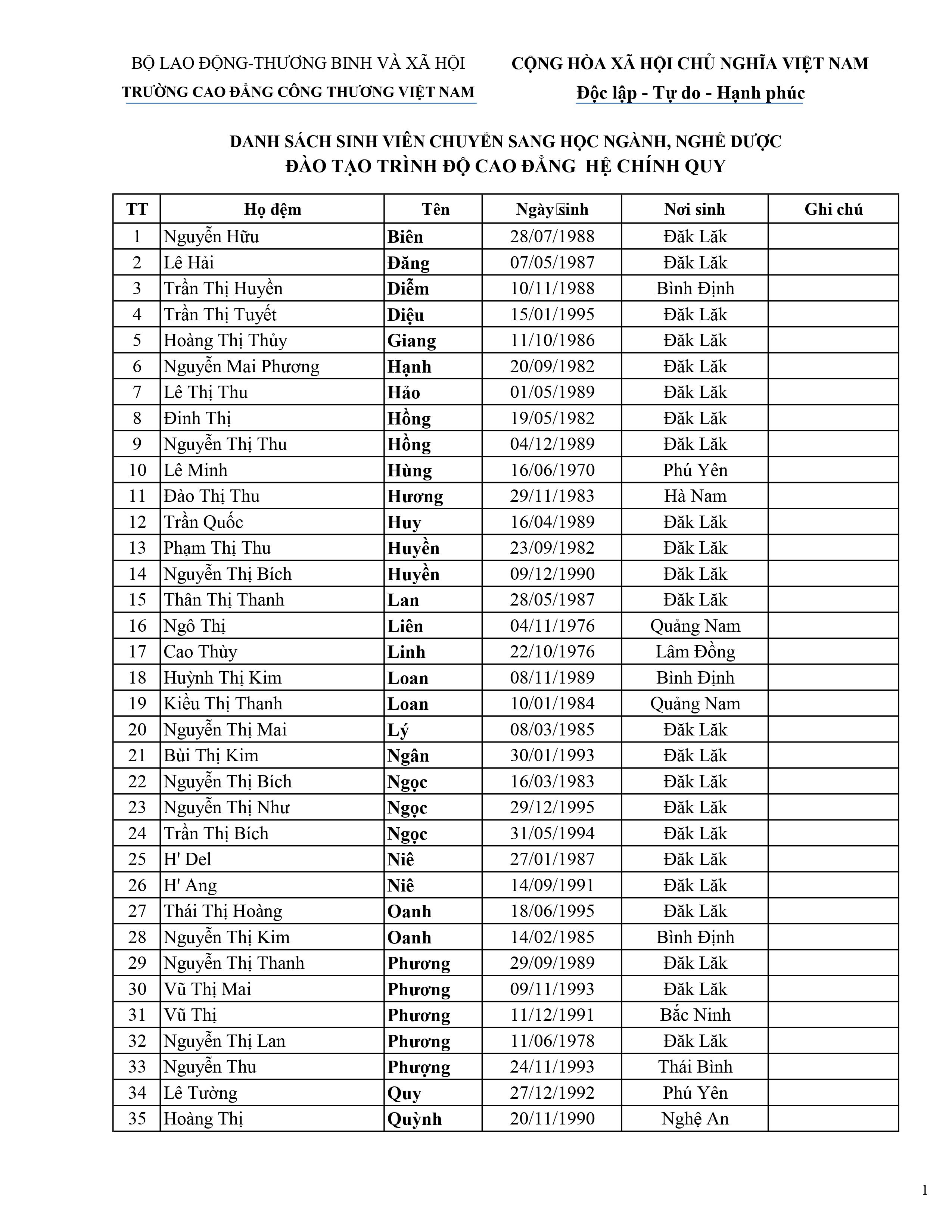 Danh sách Sinh Viên Chuyển Sang học ngành,nghề Dược trình độ Cao đẳng chính quy