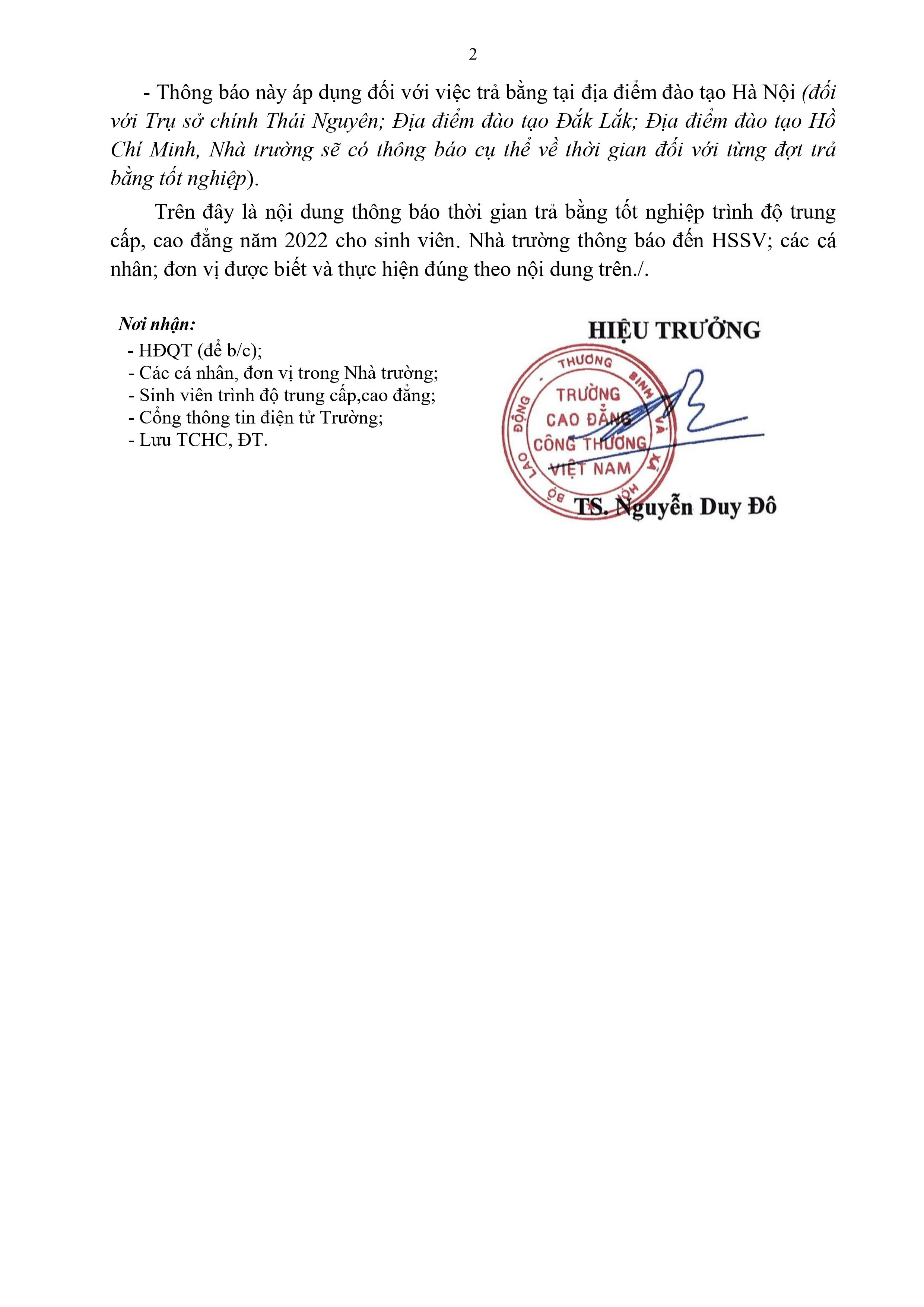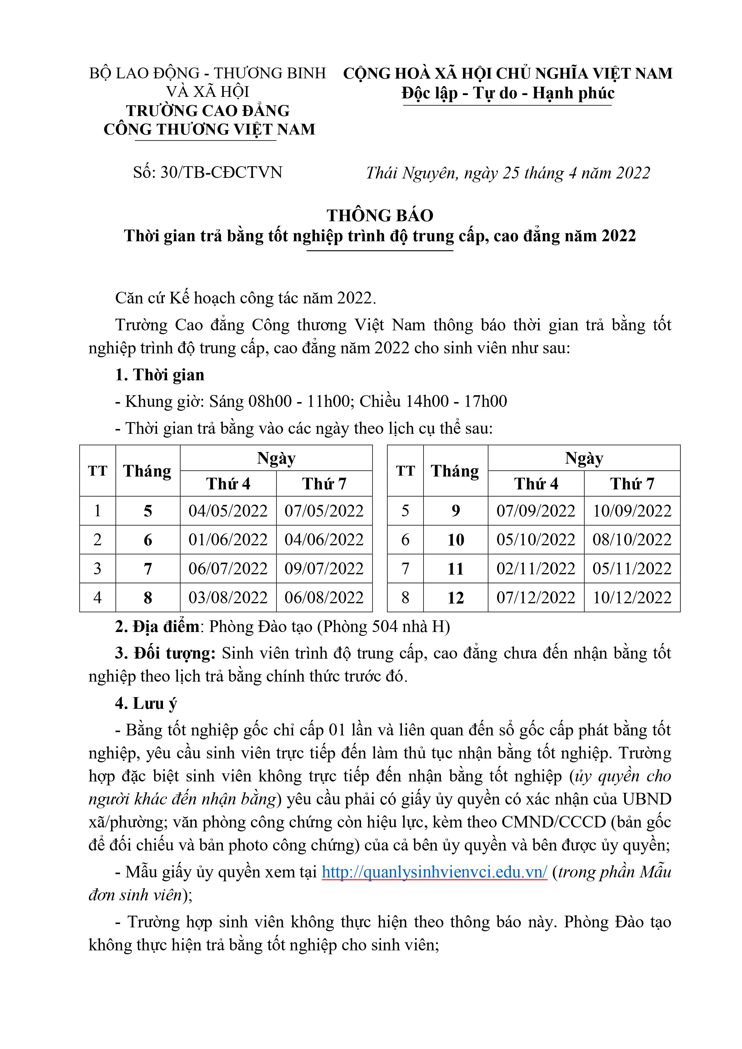 Thông Báo: Thời gian trả bằng tốt nghiệp trình độ trung cấp, cao đẳng năm 2022