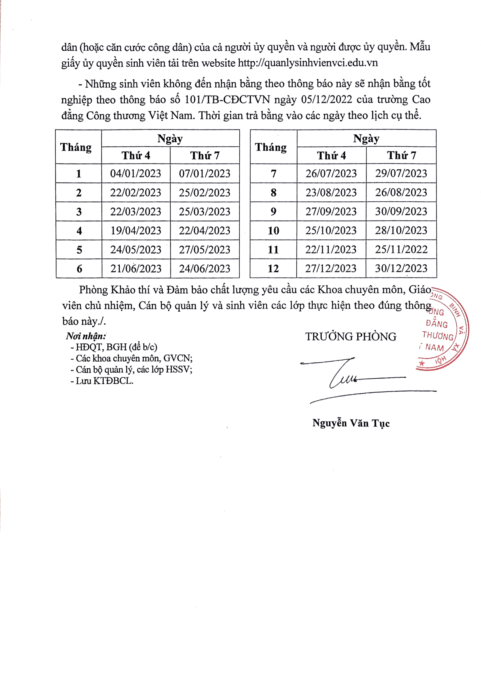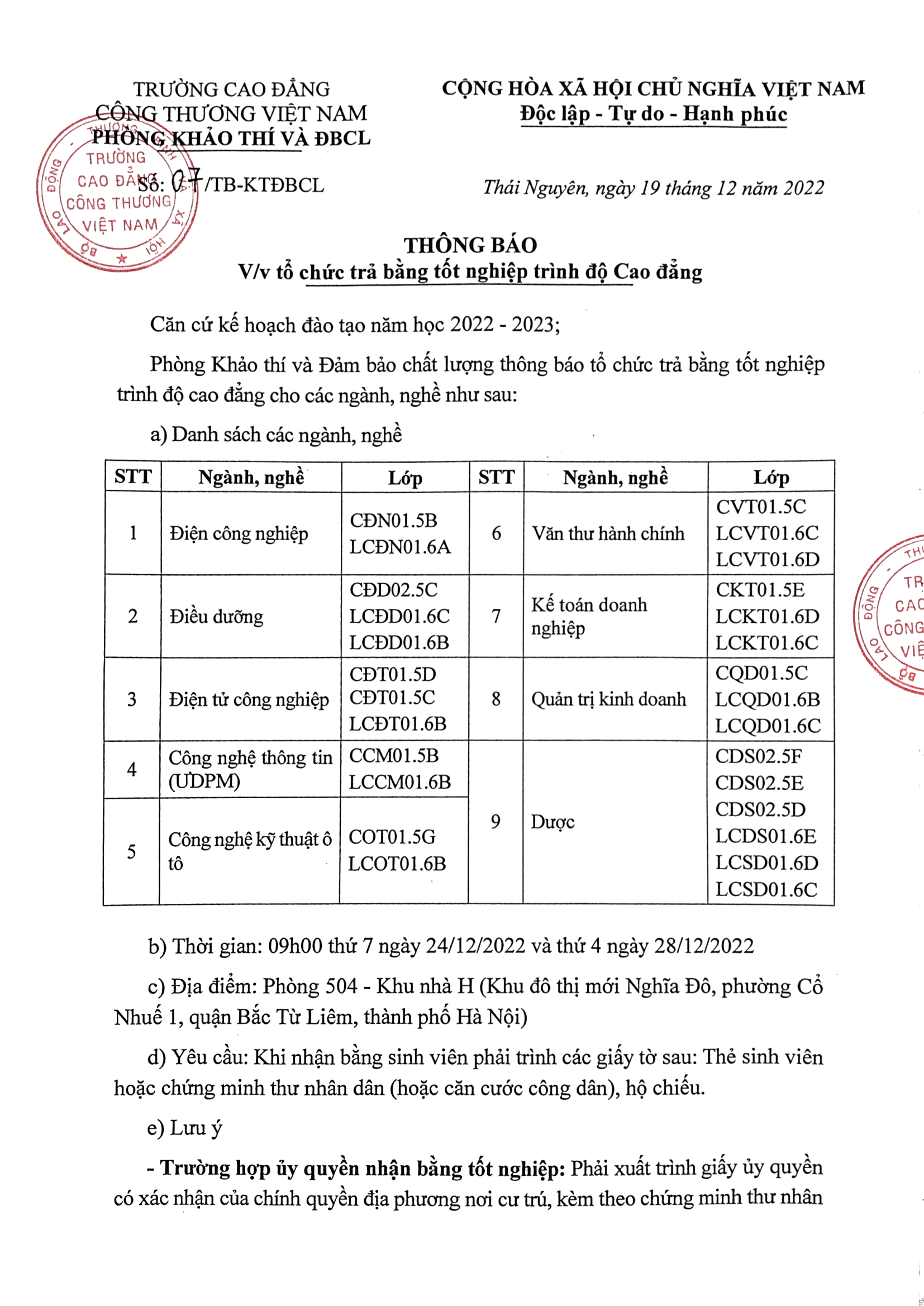 Thông Báo: Về việc tổ chức trả bằng tốt nghiệp trình độ cao đẳng 2022-2023