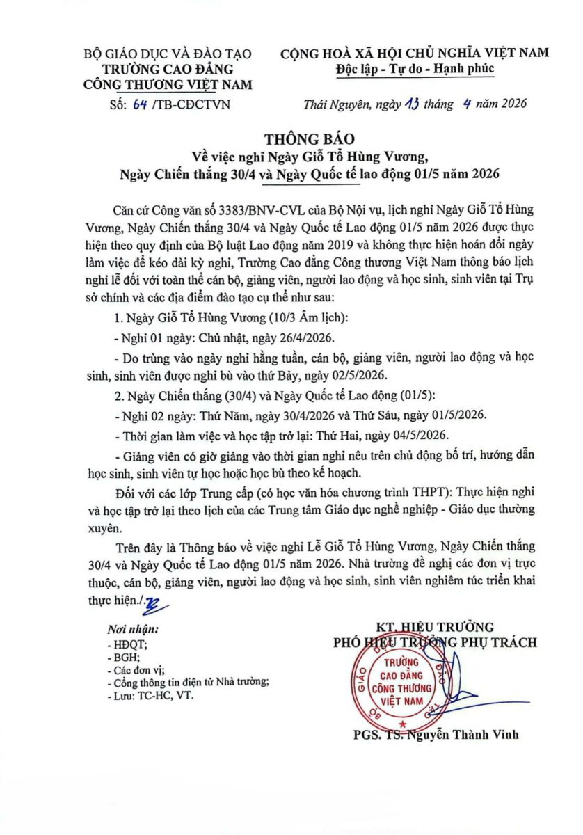 THÔNG BÁO VỀ VIỆC NGHỈ NGÀY GIỖ TỔ HÙNG VƯƠNG, NGÀY CHIẾN THẮNG 30/4 VÀ NGÀY QUỐC TẾ LAO ĐỘNG 01/5/2026